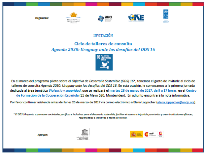 170328 – 28 marzo, 9 a 17 hs – Jornada «Violencia y seguridad» del Ciclo de Talleres de consulta sobre Agenda 2030: Uruguay ante los desafíos del ODS 16 Publicado el marzo 27, 2017 por Vida y Educación Descargar programa: Programa Taller Violencia y Seguridad Descargar otros documentos: Nota informativa-ciclo ODS161 2017 03 24 Documento de trabajo ODS16 Area Seguridad y Violencia Comparte esto: Haz clic para compartir en LinkedIn (Se abre en una ventana nueva) LinkedIn Haz clic para compartir en Facebook (Se abre en una ventana nueva) Facebook Haz clic para imprimir (Se abre en una ventana nueva) Imprimir Haz clic para enviar un enlace por correo electrónico a un amigo (Se abre en una ventana nueva) Correo electrónico Me gusta Cargando... Relacionado