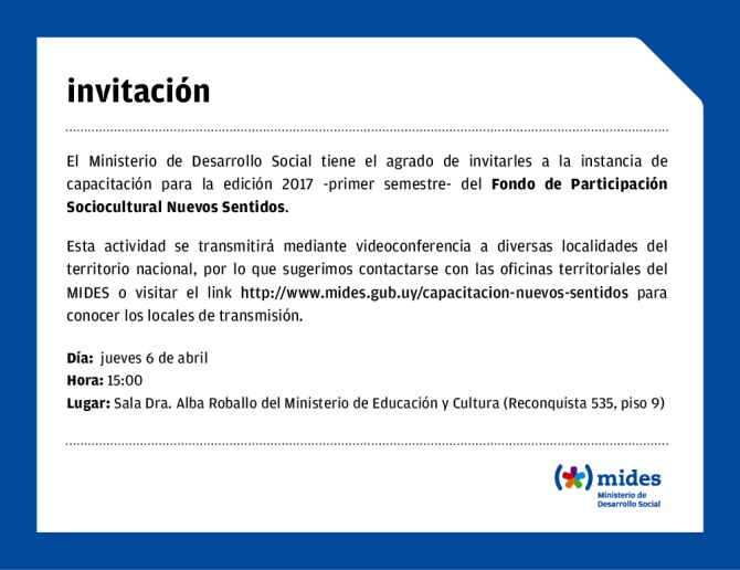 El Ministerio de Desarrollo Social tiene el agrado de invitarlos a una capacitación para organizaciones y colectivos que se deseen presentarse a los Fondos de Participación Sociocultural. Solicitamos se extienda la invitación a colectivos y técnicos que puedan estar interesados.El evento se transmitirá mediante videoconferencia, pueden encontrar los locales de transmisión en: http://www.mides.gub.uy/capacitacion-nuevos-sentidos