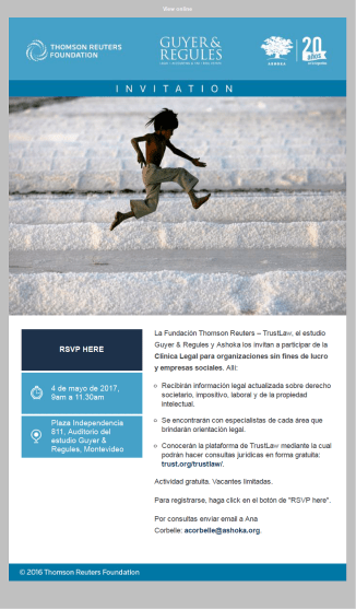 170504 – 4 mayo, 9 a 11:30 hs – Actividad sobre: Clínica Legal para organizaciones sin fines de lucro y empresas sociales Publicado el abril 12, 2017 por Vida y Educación Descargar documento:Invitación – Clínica Legal – Montevideo 4 5 17 (2)1 Comparte esto: Haz clic para compartir en LinkedIn (Se abre en una ventana nueva) LinkedIn Haz clic para compartir en Facebook (Se abre en una ventana nueva) Facebook Haz clic para imprimir (Se abre en una ventana nueva) Imprimir Haz clic para enviar un enlace por correo electrónico a un amigo (Se abre en una ventana nueva) Correo electrónico Me gusta Cargando...
