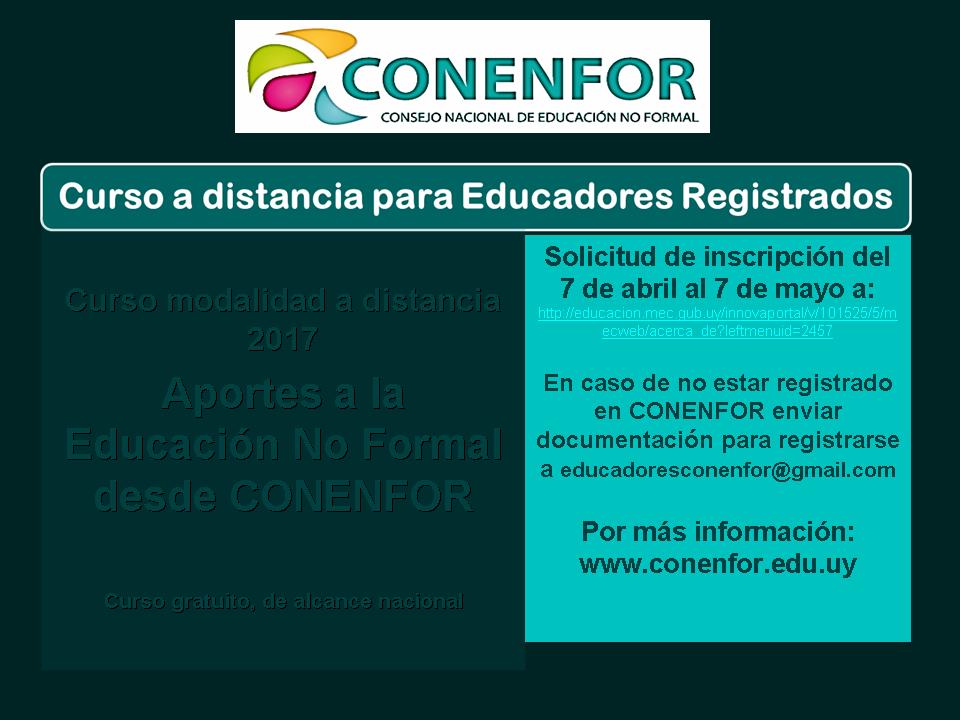 Publicado abril 27, 2017 en 960 × 720 en 170507 – hasta 7 mayo – CONENFOR – Inscripciones paraCurso para Educadores Registrados «Aportes a la Educación no formal»