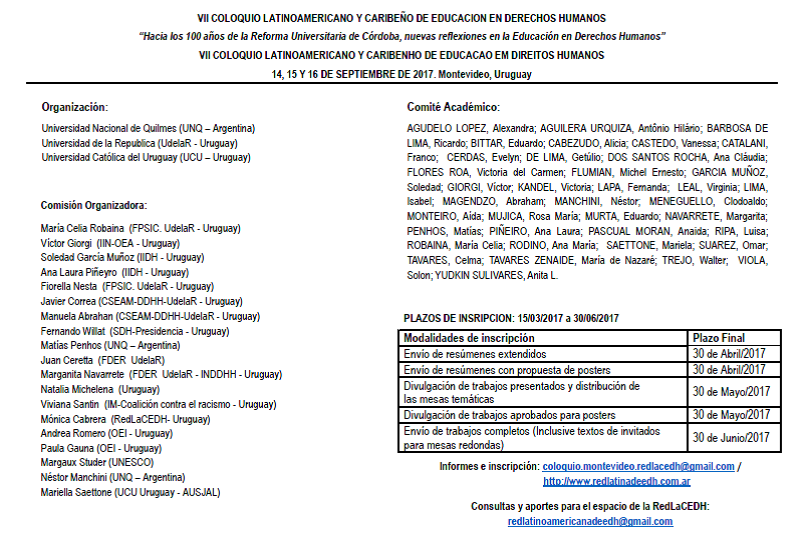 Coloquio LA EducacDDHH Publicado abril 27, 2017 en 804 × 544 en 170914 – 14 al 16 setiembre – VII Coloquio L.A. y Caribeño de Educación en Derechos Humanos Comparte esto: Compartir en LinkedIn (Se abre en una ventana nueva) LinkedIn Comparte en Facebook (Se abre en una ventana nueva) Facebook Imprimir (Se abre en una ventana nueva) Imprimir Enviar por correo electrónico un enlace a un amigo (Se abre en una ventana nueva) Correo electrónico Me gusta Cargando...