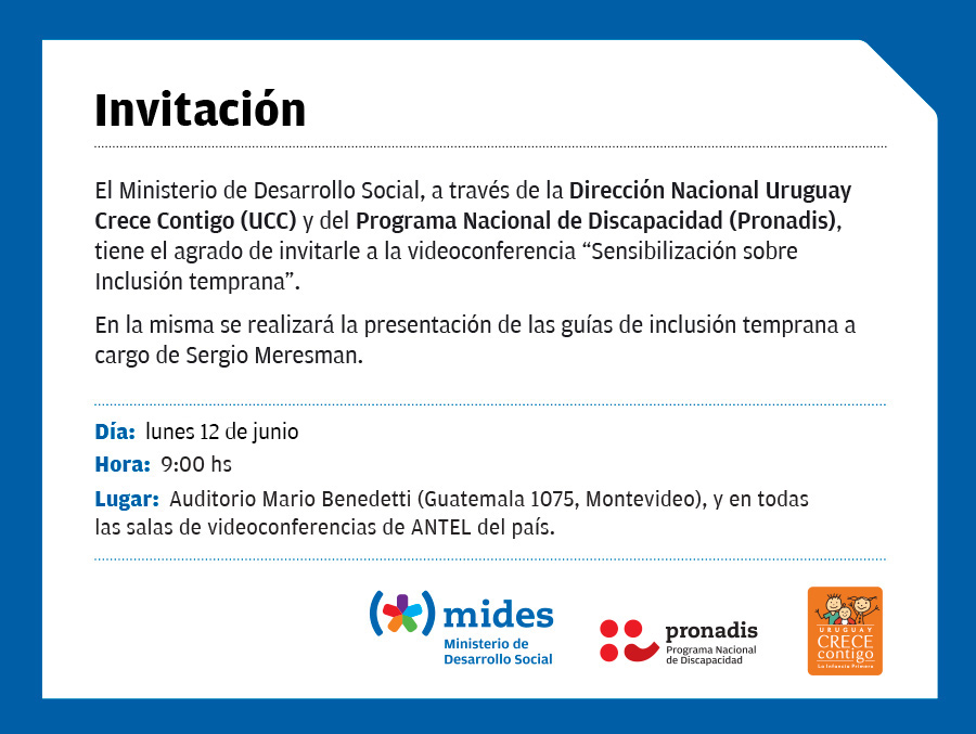 Invitacion_UCC_Pronadis 12-6-17 Publicado junio 6, 2017 en 900 × 677 en 170612 – 12 de junio, 9 hs – Videoconferencia «Presentación de Guías de Inclusión temprana» Comparte esto: Compartir en LinkedIn (Se abre en una ventana nueva) LinkedIn Comparte en Facebook (Se abre en una ventana nueva) Facebook Imprimir (Se abre en una ventana nueva) Imprimir Enviar un enlace a un amigo por correo electrónico (Se abre en una ventana nueva) Correo electrónico Me gusta Cargando...