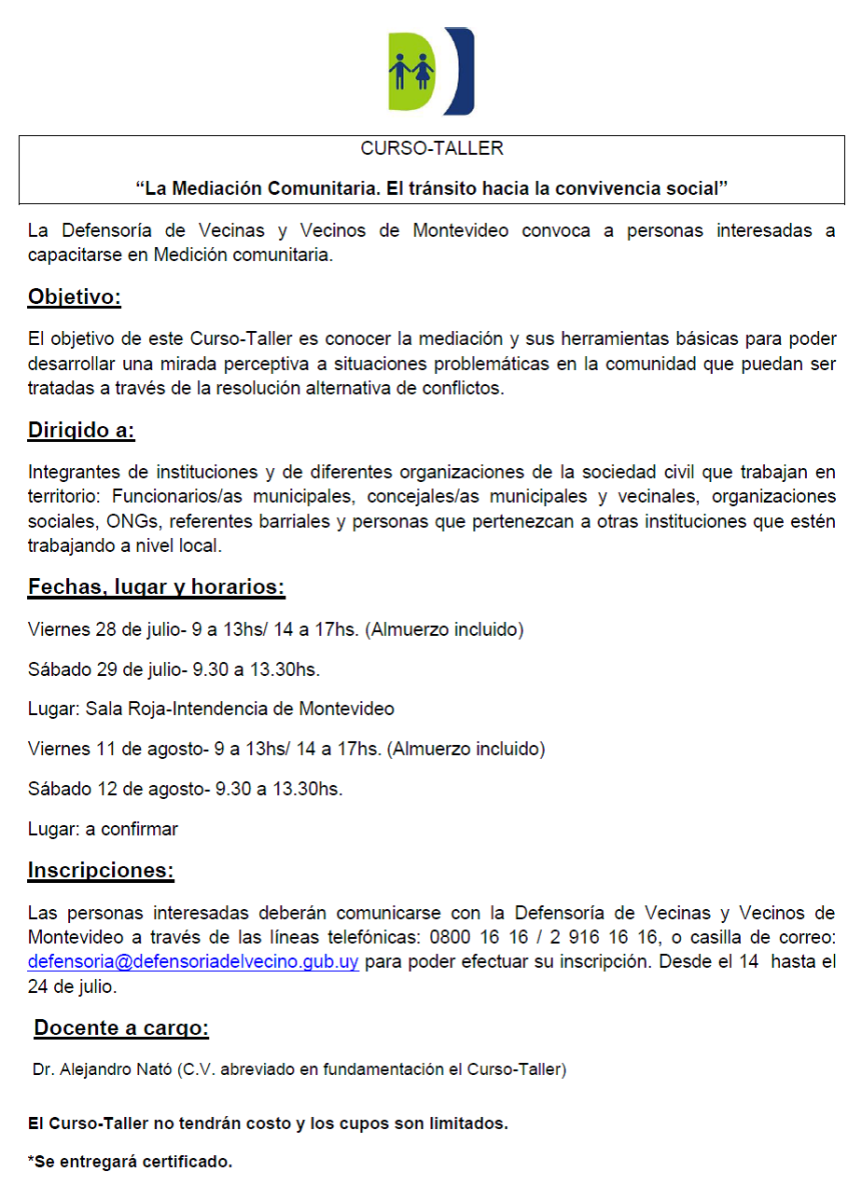 Publicado julio 20, 2017 en 924 × 1286 en 170724 – hasta 24 julio – Inscripciones al Curso-Taller «La Mediación Comunitaria» – Defensoría de Vecinos y Vecinas de Montevideo