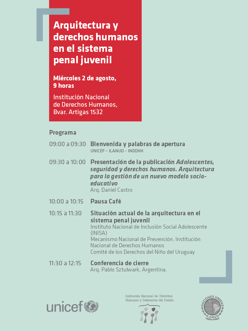 Publicado agosto 1, 2017 en 800 × 1067 en 170802 – 2 agosto, 9 hs – INDDHH/ Unicef / Ilanud: Arquitectura y derechos humanos en el sistema penal juvenil