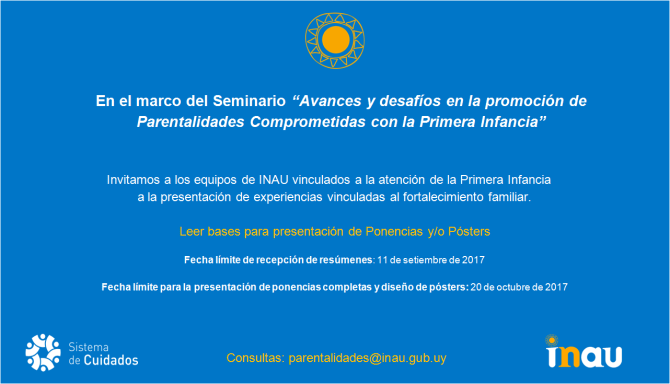 Desde INAU Primera Infancia agradecemos la difusión de esta convocatoria, en tanto entendemos relevante la participación de los equipos de INAU en socializar sus experiencias de fortalecimiento de las Parentalidades en el marco de la atención de la PI.