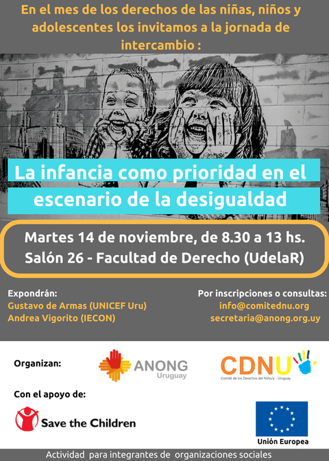 Anong y CteDDNN Publicado noviembre 7, 2017 en 480 × 672 en 171114 – 14 noviembre, de 8:30 a 13 hs – ANONG y Cte DNU – Jornada de intercambio «La Infancia como Prioridad en el Escenario de la Desigualdad». Comparte esto: Compartir en LinkedIn (Se abre en una ventana nueva) LinkedIn Comparte en Facebook (Se abre en una ventana nueva) Facebook Imprimir (Se abre en una ventana nueva) Imprimir Enviar un enlace a un amigo por correo electrónico (Se abre en una ventana nueva) Correo electrónico Me gusta Cargando...