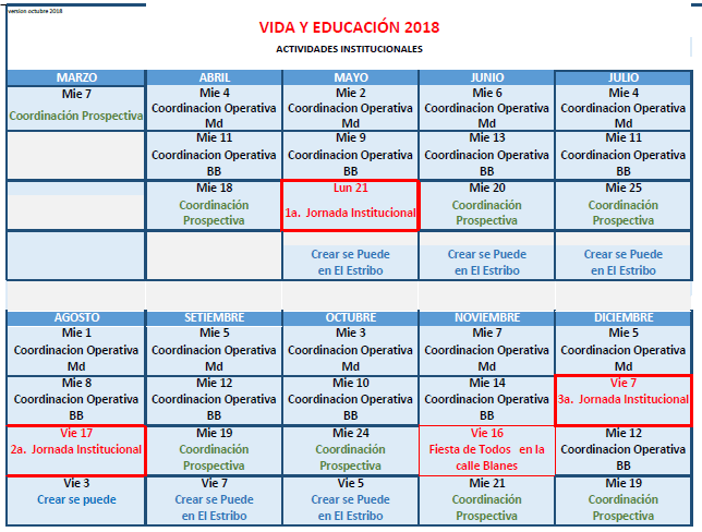 180301 – Calendario de Actividades Institucionales 2018 de VIDA Y EDUCACIÓN Imagen | Publicado el abril 4, 2018 por Vida y Educación Descargar en PDF: VYE Calendario anual 2018 v4 Comparte esto: Compartir en LinkedIn (Se abre en una ventana nueva) LinkedIn Comparte en Facebook (Se abre en una ventana nueva) Facebook Imprimir (Se abre en una ventana nueva) Imprimir Enviar un enlace a un amigo por correo electrónico (Se abre en una ventana nueva) Correo electrónico Me gusta Cargando... Relacionado