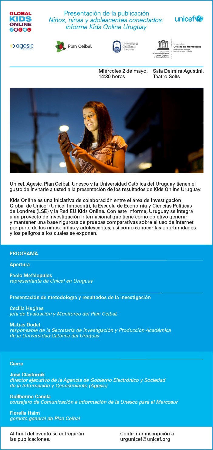 Presentación de la publicación Niños, niñas y adolescentes conectados Publicado abril 24, 2018 en 702 × 1479 en 180502 – 2 mayo, 14:30 hs – Presentación de la publicación Niños, niñas y adolescentes conectados: informe Kids Online Uruguay Comparte esto: Compartir en LinkedIn (Se abre en una ventana nueva) LinkedIn Comparte en Facebook (Se abre en una ventana nueva) Facebook Imprimir (Se abre en una ventana nueva) Imprimir Enviar por correo electrónico un enlace a un amigo (Se abre en una ventana nueva) Correo electrónico Me gusta Cargando...
