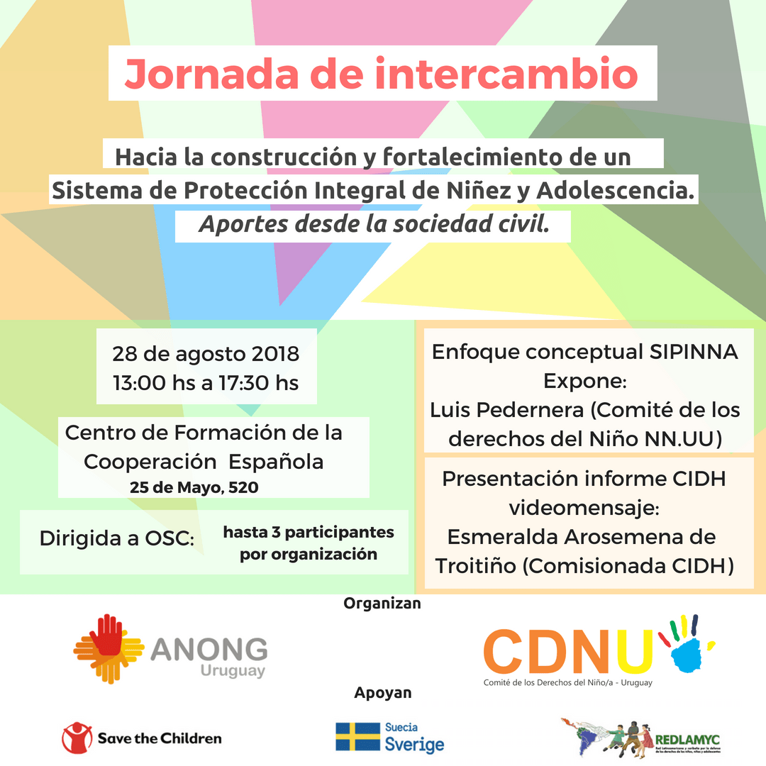 Aportes para la construccioÌn y fortalecimiento de un Sis Publicado agosto 21, 2018 en 1080 × 1080 en 180828 – 28 agosto, 13 a 17 hs – Jornada de intercambio: «Hacia la construcción y fortalecimiento de un Sistema Integral de Protección Integral de Niñez y Adolescencia. Aportes desde la sociedad civil» Comparte esto: Compartir en LinkedIn (Se abre en una ventana nueva) LinkedIn Comparte en Facebook (Se abre en una ventana nueva) Facebook Imprimir (Se abre en una ventana nueva) Imprimir Enviar un enlace a un amigo por correo electrónico (Se abre en una ventana nueva) Correo electrónico Me gusta Cargando...