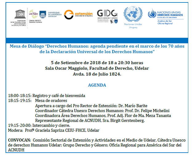 Publicado agosto 31, 2018 en 624 × 508 en 180905 – 5 setiembre, de18 a 20:30 hs -Mesa de Diálogo “Derechos Humanos: agenda pendiente en el marco de los 70 años de la Declaración Universal de los Derechos Humanos”