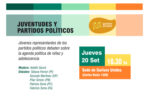 Juventudes y Partidos politicos Publicado septiembre 18, 2018 en 614 × 406 en 180920 – 20 setiembre, 18:30 hs – Jóvenes representantes de partidos políticos debaten sobre la agenda política de niñez y adolescencia Comparte esto: Compartir en LinkedIn (Se abre en una ventana nueva) LinkedIn Comparte en Facebook (Se abre en una ventana nueva) Facebook Imprimir (Se abre en una ventana nueva) Imprimir Enviar un enlace a un amigo por correo electrónico (Se abre en una ventana nueva) Correo electrónico Me gusta Cargando...