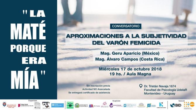 181017 – 17 octubre, 19 hs – «La maté porque era mía» Conversatorio: Aproximaciones a la subjetividad del varón femicida» Publicado el octubre 3, 2018 por Vida y Educación En Aula Magna de la Facultad de Psicologia de UDELAR, el miércoles 17 de octubre e 2018, a las 19 hs. Tristan Narvaja 1674 Comparte esto: Compartir en LinkedIn (Se abre en una ventana nueva) LinkedIn Comparte en Facebook (Se abre en una ventana nueva) Facebook Imprimir (Se abre en una ventana nueva) Imprimir Enviar por correo electrónico un enlace a un amigo (Se abre en una ventana nueva) Correo electrónico Me gusta Cargando... Relacionado
