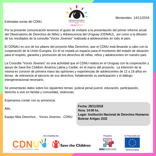 Publicado noviembre 19, 2018 en 529 × 529 en 181128 – 28 noviembre, 14 hs – Presentación del 1er. Informe Anual del Observatorio de Derechos de Niñez y Adolescencia del Uruguay