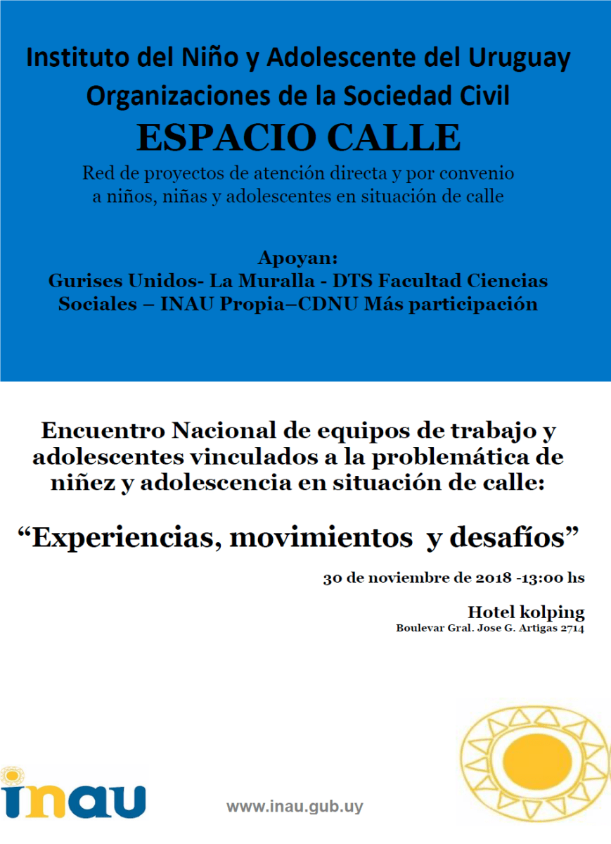 calle 30 noviembre Publicado noviembre 28, 2018 en 952 × 1314 en 181130 – 30 noviembre, 13 hs – Encuentro Nacional de equipos de trabajo y adolescentes vinculados a la problemática de niñez y adolescencia en situación de calle Comparte esto: Compartir en LinkedIn (Se abre en una ventana nueva) LinkedIn Comparte en Facebook (Se abre en una ventana nueva) Facebook Imprimir (Se abre en una ventana nueva) Imprimir Enviar un enlace a un amigo por correo electrónico (Se abre en una ventana nueva) Correo electrónico Me gusta Cargando...