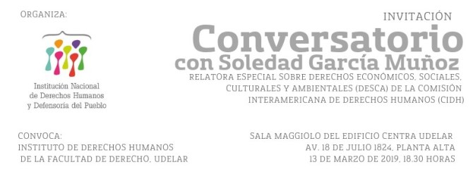 La Institución Nacional de Derechos Humanos y Defensoría del Pueblo tiene mucho gusto de invitar a Ud. el próximo miércoles 13 de marzo a las 18.30 horas a un conversatorio con Soledad García Muñoz, Relatora Especial sobre Derechos Económicos, Sociales, Culturales y Ambientales (DESCA) de la Comisión Interamericana de Derechos Humanos (CIDH).