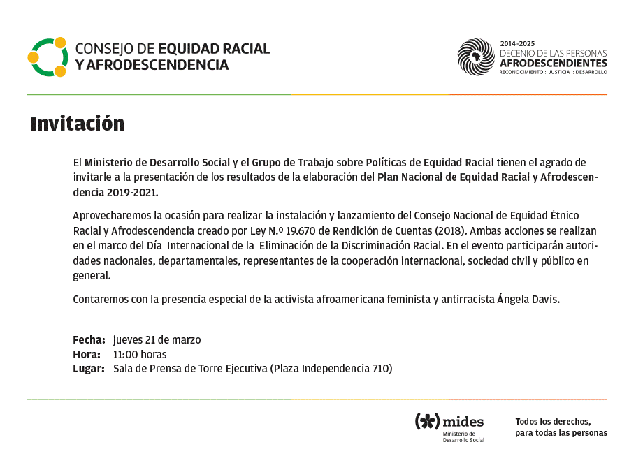 Invitacion plan nacional afrodescendientes Publicado marzo 19, 2019 en 900 × 663 en 190321 – 21 marzo, 11 hs – Presentación de los resultados de la elaboración del Plan Nacional de Equidad Racial y Afrodescendencia 2019-2021. Comparte esto: Compartir en LinkedIn (Se abre en una ventana nueva) LinkedIn Comparte en Facebook (Se abre en una ventana nueva) Facebook Imprimir (Se abre en una ventana nueva) Imprimir Enviar por correo electrónico un enlace a un amigo (Se abre en una ventana nueva) Correo electrónico Me gusta Cargando...