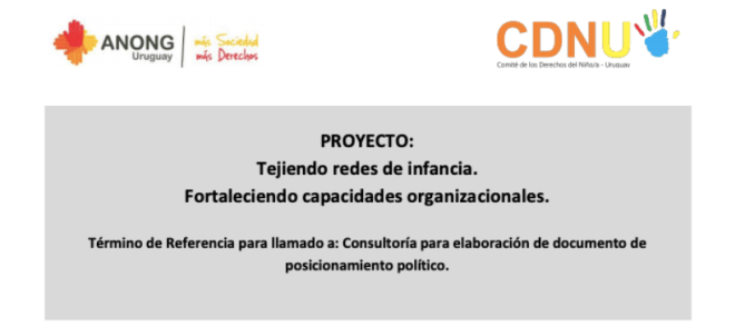 En el marco del proyecto «Tejiendo redes de infancia» que realiza la Redlamyc, el CDNU y la ANONG convocan a postulantes para la elaboración de un documento de posicionamiento político «Prioridad niñez y adolescencia»; para establecer un dialogo con presidenciables en el marco de las elecciones nacionales de 2019. Este documento se nutrirá con los datos y producciones nacionales recientes.