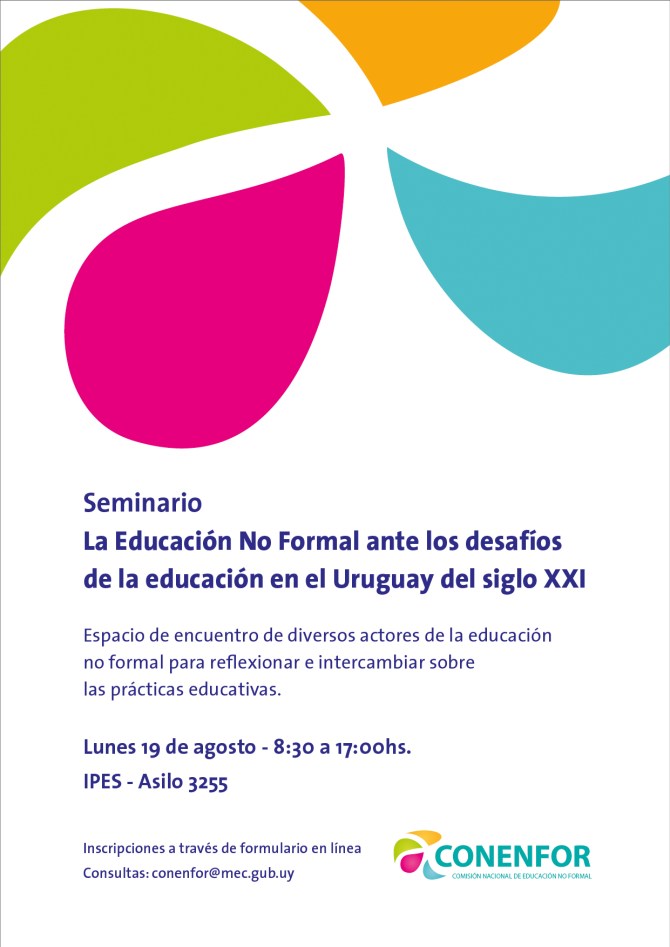 Invitamos a uds.  a participar del Seminario «La Educación no formal ante los desafíos de la educación del Uruguay del S.XXI», que se realizará el 19 de agosto, desde las 8:30 a las 17 hs. en el IPES, Asilo 3255.