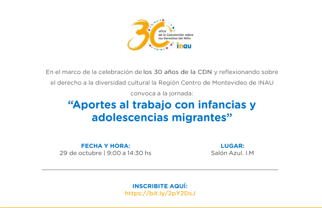 Inau Infancias migrantes Publicado octubre 21, 2019 en 632 × 408 en 191029 – 29 octubre, de 9 a 14:30 hs – INAU: «Jornada sobre infancias y adolescencias migrantes» Comparte esto: Compartir en LinkedIn (Se abre en una ventana nueva) LinkedIn Comparte en Facebook (Se abre en una ventana nueva) Facebook Imprimir (Se abre en una ventana nueva) Imprimir Enviar un enlace a un amigo por correo electrónico (Se abre en una ventana nueva) Correo electrónico Me gusta Cargando...