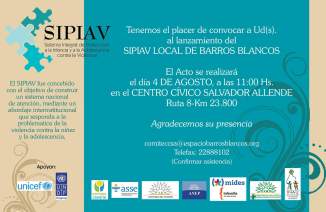 El equipo local SIPIAV convoca al lanzamiento oficial del SIPIAV Barros Blancos. El trabajo se inició en el año 2009 y se enmarca en el compromiso asumido por el Estado de dar respuestas a las situaciones de violencia que viven niños, niñas y adolescentes.