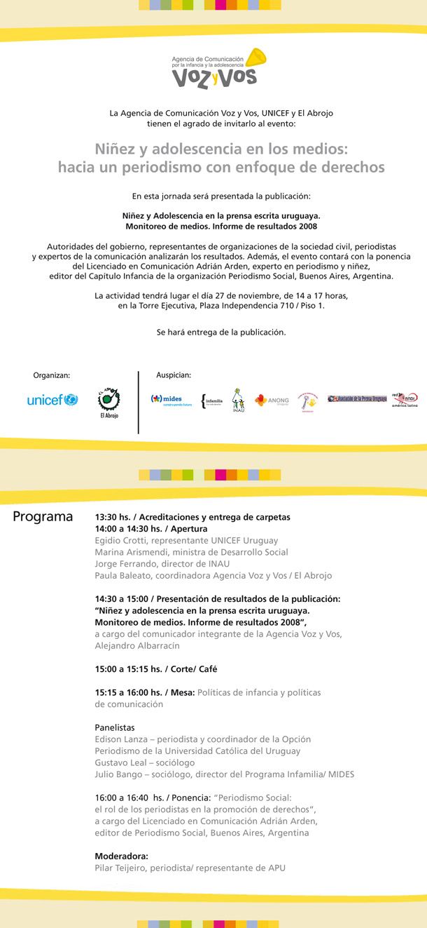 La guía, dirigida a periodistas y a quienes están actualmente estudiando para serlo, apunta a mejorar el abordaje que los medios de comunicación realizan sobre los temas de infancia y adolescencia. “¿Los periodistas podemos seguir ignorando lo que dice el Código de la Niñez y la Adolescencia?”, preguntó el periodista Edison Lanza, durante la presentación. “Yo creo que no, que es una obligación ética conocer todas las convenciones que consagran derechos e incorporarlas a nuestro trabajo”, agregó, en referencia a que muchas veces la normativa que promueve y protege los derechos de las personas menores de 18 años no se cumple porque ignoran en qué consiste.